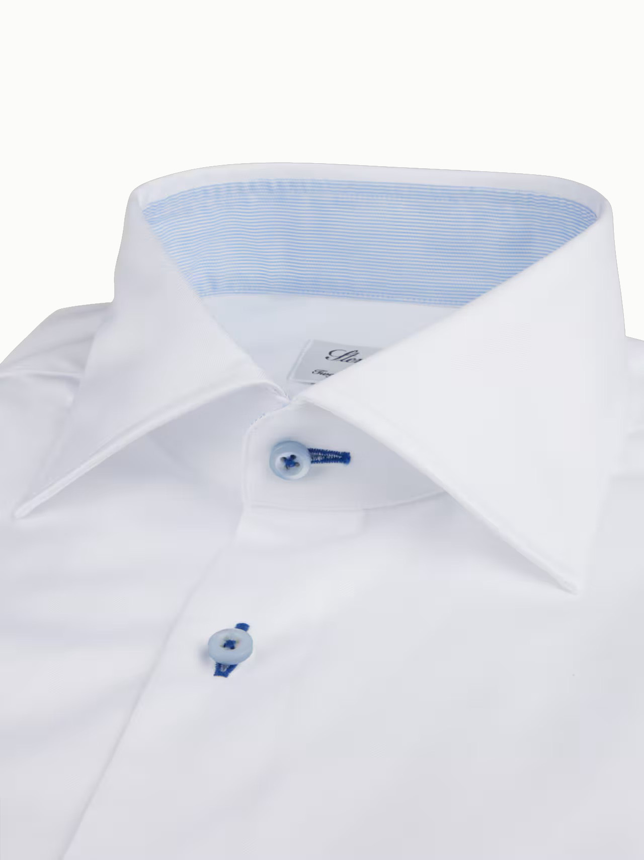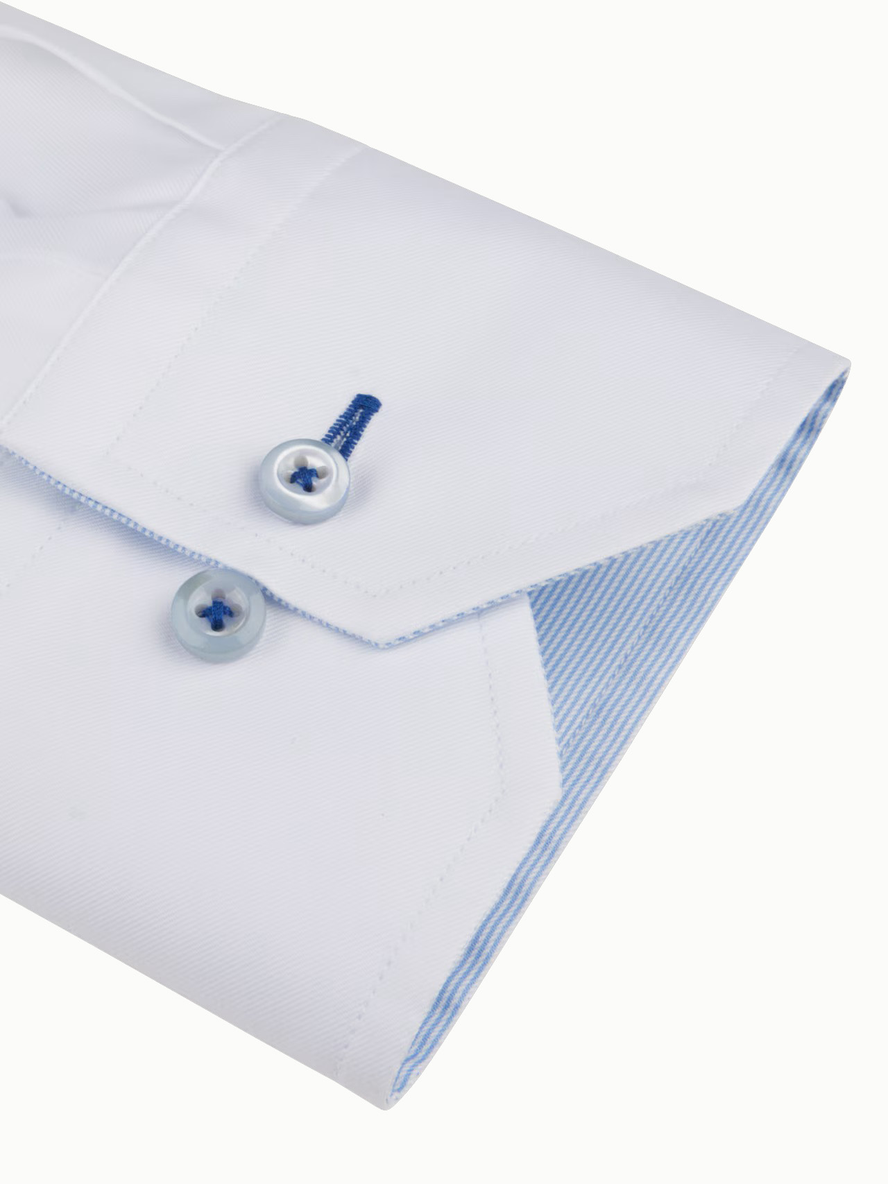 This white fitted body shirt is cut from twofold super cotton with a slightly tailored waist. It has blue striped contrasting details and navy seem around the button holes. Finished with single cuffs, blue luxurious mother of pearl buttons with navy x-stitch and a moderate cut away collar. This versatile piece looks great tucked into tailored pants or worn loose with denim.